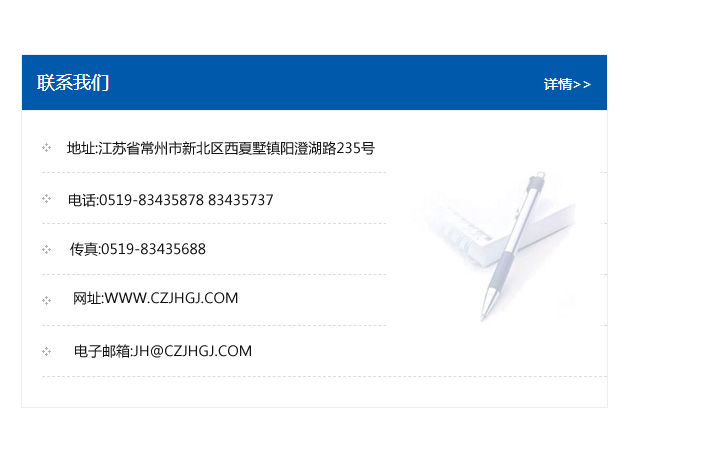 地址:常州市新北區友邦商務大廈1幢16、17層  電話:0519-85101652  傳真:0519-85112595  郵編:213022  網址:www.cz-jiayue_cn.nefkj.com  郵箱:xiajifengaa@163.com